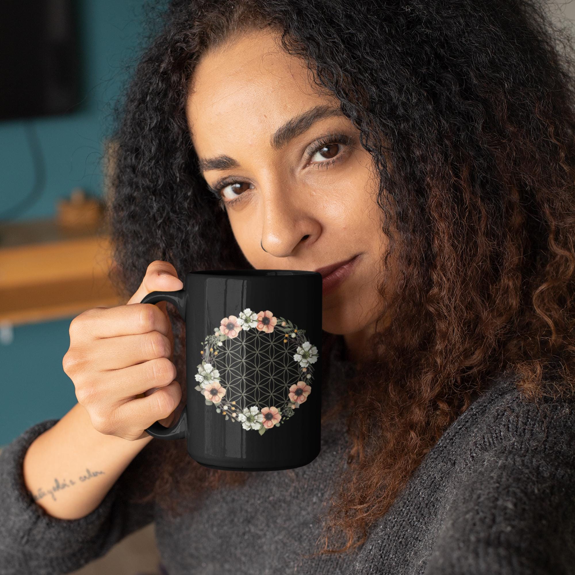 Double-Sided Design: One side features a wreath of delicate Anemone and Cosmos flowers surrounding the Sacred 'Flower of Life' Geometric design. The reverse features a positive "Coffee Spell" so that you never forget your daily affirmation and blessing!