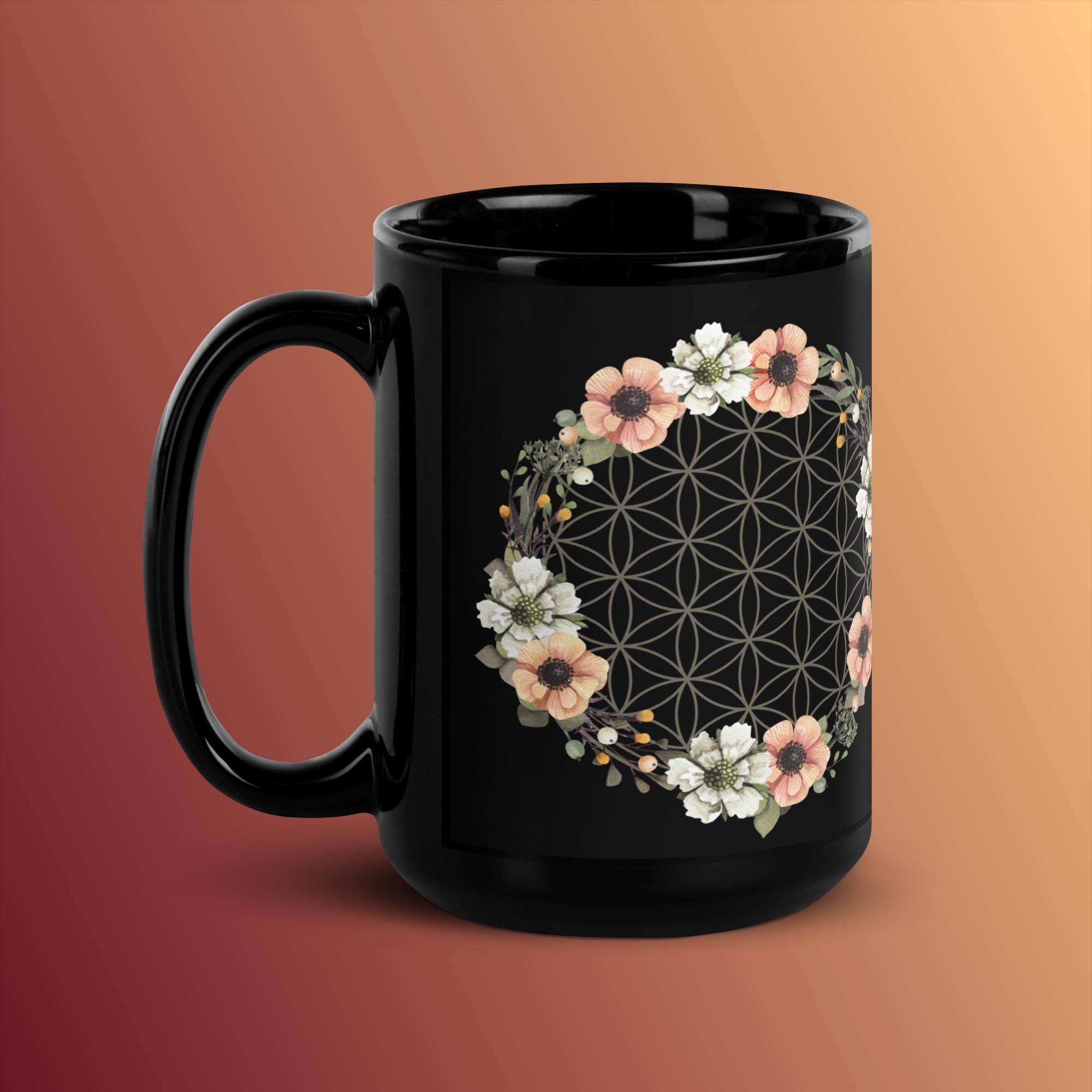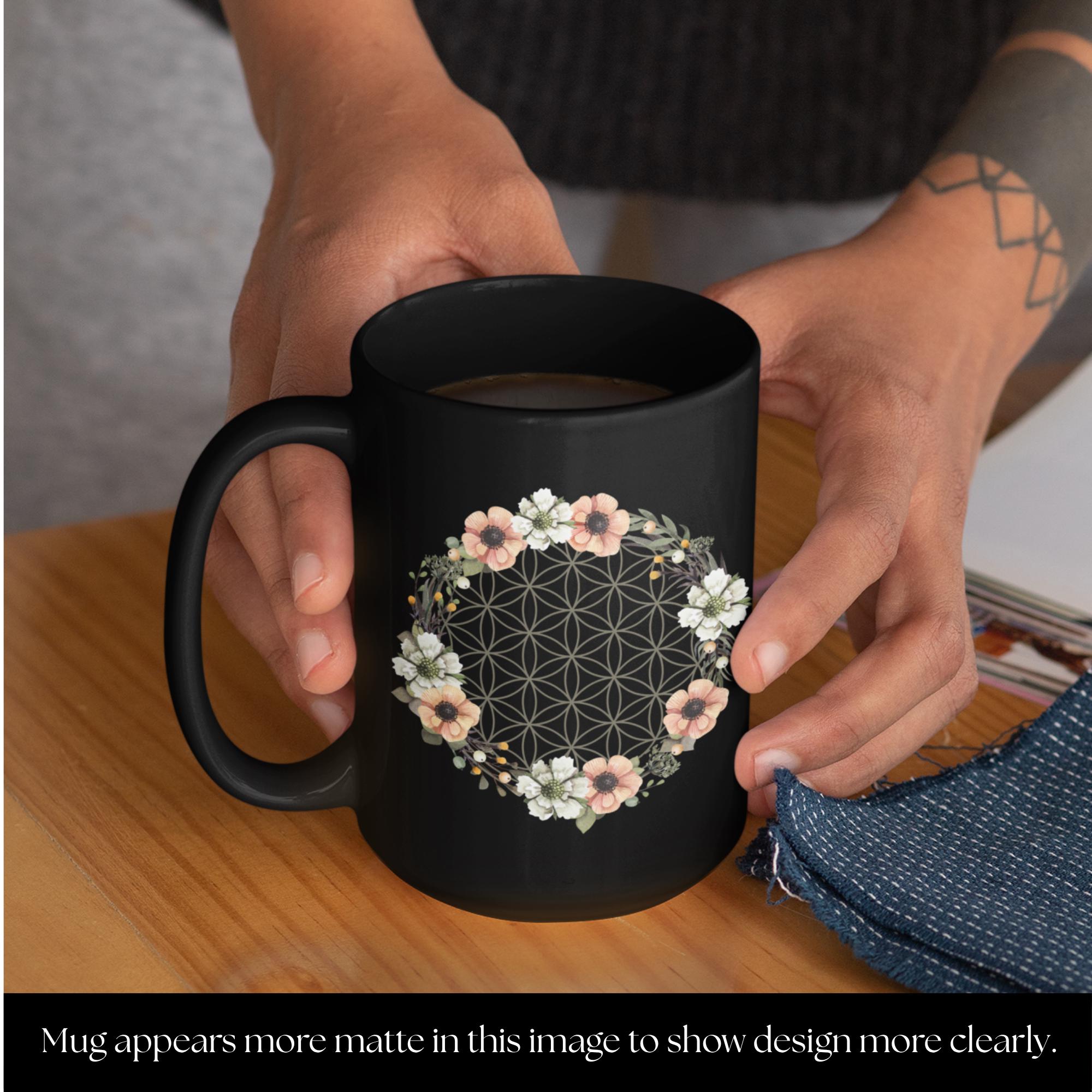 Flower of Life Wreath Sacred Geometry Glossy Black Mug with Daily Affirmation