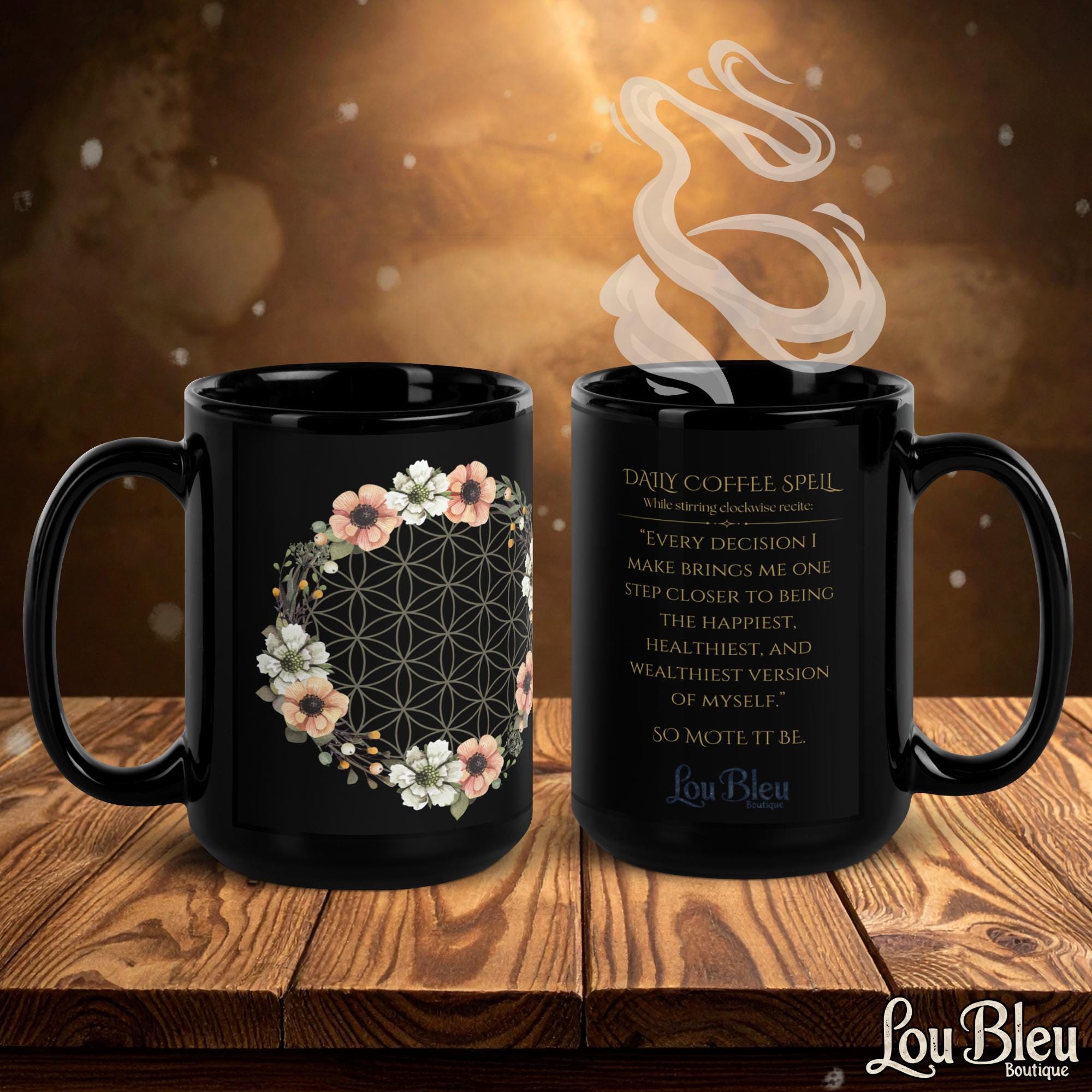 Transform your daily caffeination into a intentional ritual. While stirring up a tasty matcha, an energizing coffee, or a comforting tea, these 15oz glossy black mugs bring a touch of magic to your morning. Inspired by Vintage Botanicals and Sacred Geometry, each mug features a unique floral design on the front and a simple yet powerful abundance and prosperity spell on the back.