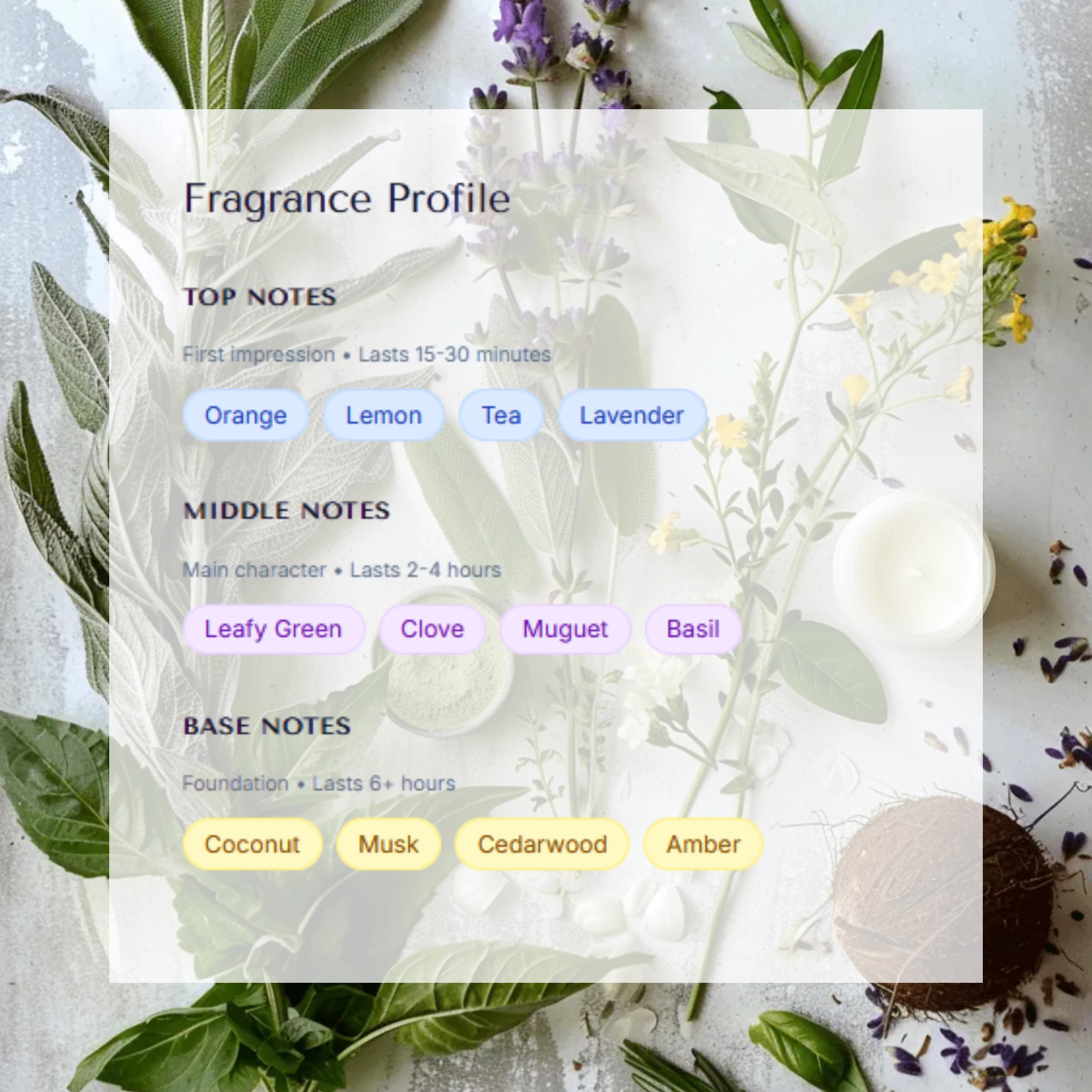 Discover the calming and aromatic blend of Sage + Lavender. This enchanting fragrance begins with a refreshing com- bination of lemon, tea, lavender, and orange, creating a bright and uplifting opening. The heart of the scent unfolds with a harmonious mix of leafy green notes, muguet (lily of the valley), clove, and basil, adding a touch of herbal and floral sophistication. As the fragrance evolves, the base notes of musk, coconut, cedarwood, and amber provide a warm and soothing finish, wrapping you in a tranquil and comforting embrace. Ideal for those who appreciate a balance of fresh, herbal, and warm elements, White Sage + Lavender is a scent that brings serenity and elegance to any moment.